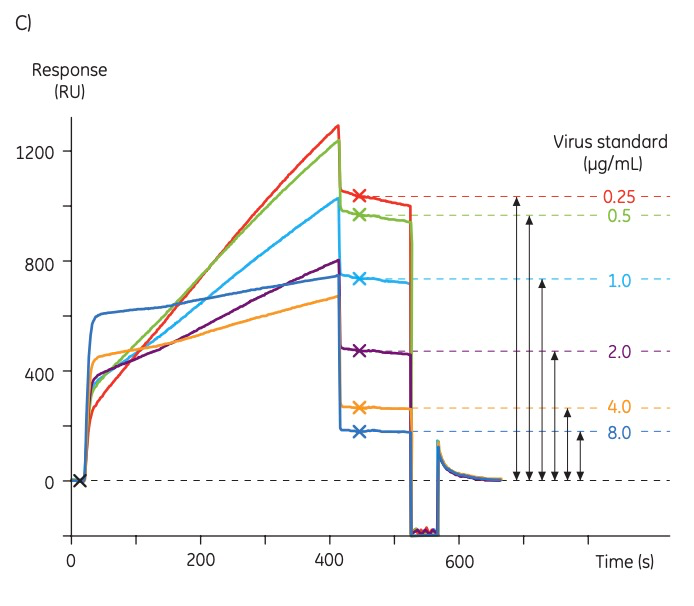 标准曲线:梯度稀释免疫过的羊血清标准品(含有针对特定流感菌株的抗体),设置进样400 s,该稀释倍数需要大约结合1000 RU的信号。在这样的稀释倍数下,标准曲线的动态范围会达到0.5-8 µg病毒/mL。在检测的开始、中间和结束各运行了三条校准曲线。