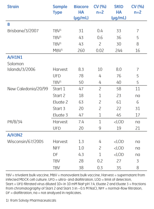 针对流感病毒定量实验开发时,Biacore方法也与SRID方法进行了对比。样品来自流感疫苗纯化过程中不同步骤的样本,包括从细胞培养上清液到最终过滤产品。为了进行比较,还使用SRID(单径向免疫扩散法)对相同样本进行了分析,从对比数据可以评估它们的准确性、一致性以及重复性。
