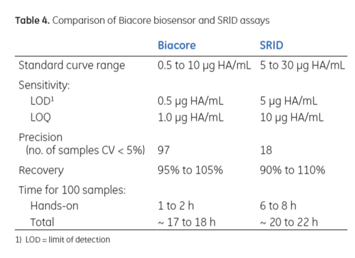 表2:比较Biacore定量检测和SRID定量检测