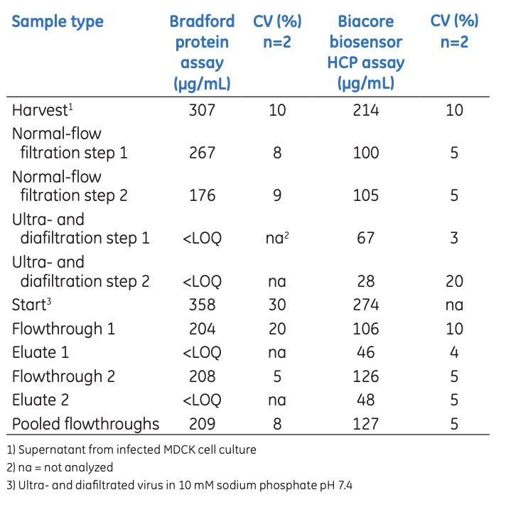 对于工艺样本,通过Bradford蛋白检测法分析的样本显示的蛋白质浓度值通常比使用Biacore定量HCP检测法分析得到的值要高。这是因为Bradford方法检测的是样本中的总蛋白质含量,这包括病毒蛋白以及其他非HCP的蛋白质。然而,Biacore通过特异性结合,定量检测HCP浓度,具有较好的特异性。Bradford的定量限为60 µg/mL,而Biacore定量限 (LOQ) 为0.3 µg/mL(表3),Biacore检测法显示出了比Bradford蛋白检测法高100倍以上的灵敏度。有了这样的定量限,在工艺开发过程中可以量化更广泛范围的样本。