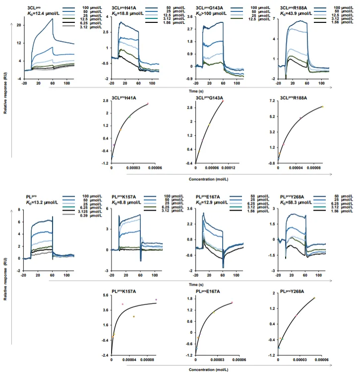 图1. Biacore测定Schaftoside与3CLpro、PLpro及其突变体的亲和力图谱