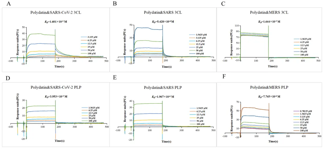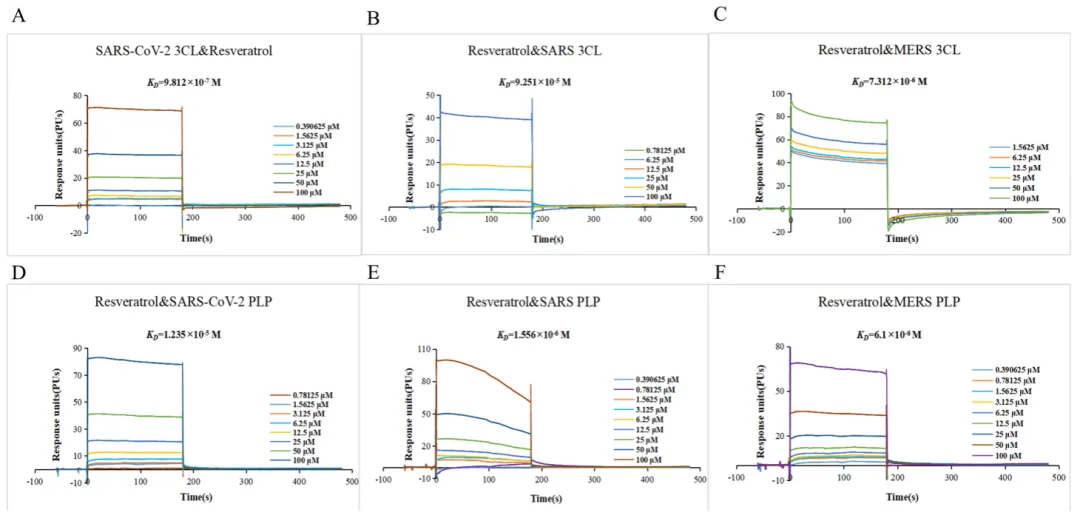图2. Biacore检测白藜芦醇苷与SARS-CoV-2、SARS-CoV和MERS-CoV的3CLpro和PLpro亲和力图谱