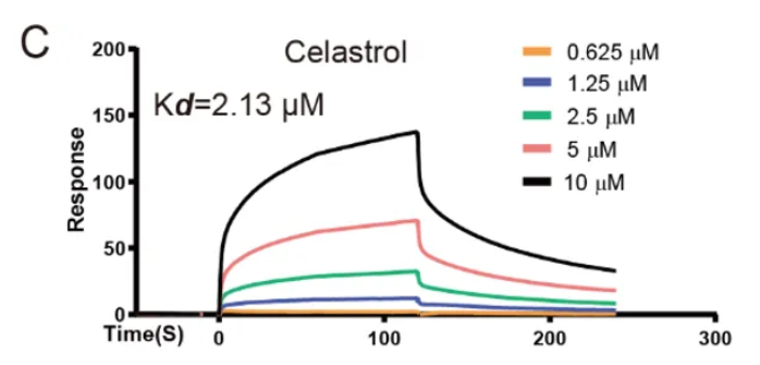 实验中将Sorcin蛋白氨基偶联于传感芯片,Biacore预设的筛选程序自动完成304个天然产物的单浓度进样,得到每个药物与靶点蛋白的结合响应值(RU),经过分析软件的分子量校准之后,成功鉴定出雷公藤红素(Celastrol)能够与Sorcin蛋白发生特异性结合(图1)。
