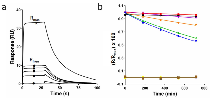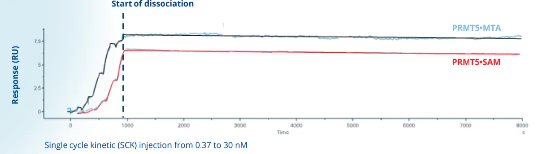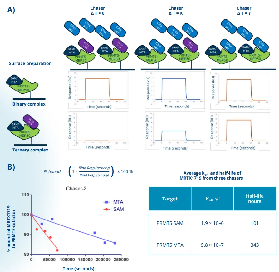 为了明确MRTX1719与PRMT5的亲和力,研究人员引入了与MRTX1719竞争性结合PRMT5的小分子作为chaser,首先在芯片表面构建MRTX1719-PRMT5•SAM/PRMT5•MTA药物-靶点复合物作为三元实验组,PRMT5•SAM/PRMT5•MTA作为二元对照组,在不同时间进样chaser。可以看出,三元实验组通道上,随着解离时间的延长,MRTX1719解离量增加,chaser结合信号提高。通过计算芯片上配体的结合率,来获得解离速率和半衰期数据【3】。