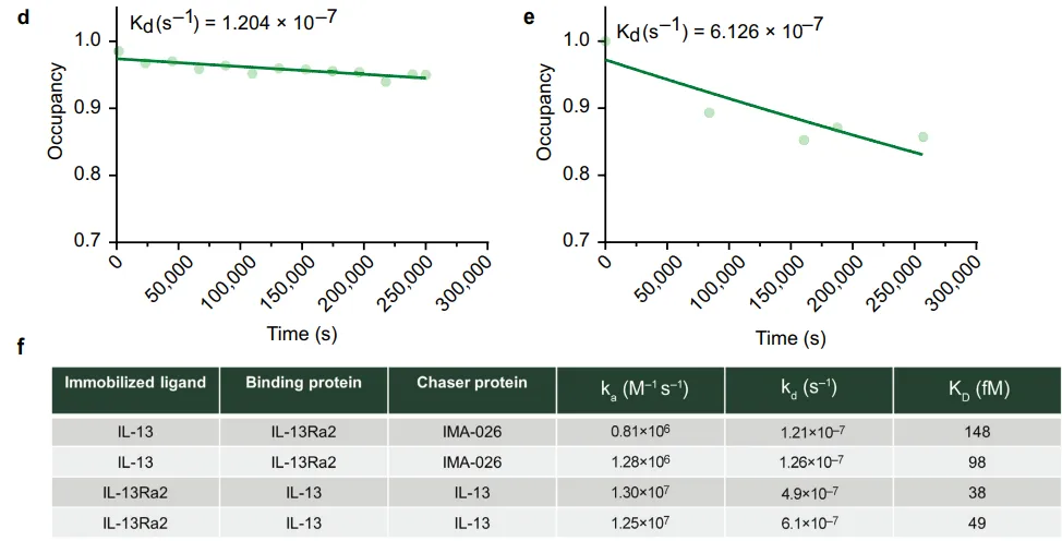 为了阐明曲罗芦单抗通过IL-13Ra2干扰IL-13内源性调节的程度,IL-13 vs IL-13Ra2的亲和力检测迫在眉睫。为此,参考基因泰克2018年发表的文章,作者进一步开发了一种简单而有效的办法:使用分析物本身或抗体作为chaser,引入芯片上配体分子的结合率(occupancy)概念,来计算超长时间(300000 s约3.5 d)的解离速率kd,再将此解离速率代入到常规二元单循环动力学实验中,拟合得到ka和KD【2】。