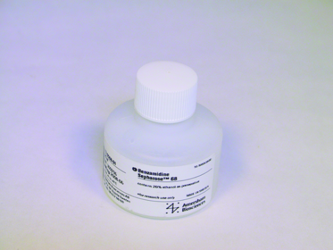 Benzamidine Sepharose 6B is p-aminobenzamidine covalently attached to Sepharose 6B by the epoxy coupling method. p-Aminobenzamidine (PAB), is a synthetic inhibitor of trypsin-like serine protease. Trypsin and trypsin-like serine proteases bind to Benzamidine Sepharose 6B and can thus be used for purification and/or removal of these substances. Trypsin, bovine thrombin, urokinase, human enterokinase, acrosin, native plasminogen, kallikrein, prekallikrein, collagenase and clostripain are some of the serine proteases that have been purified on Benzamidine Sepharose 6B. For recombinant purification, Benzamidine Sepharose 6B can be used for removal of serine proteases such as thrombin and enterokinase after cleavage of purification tags