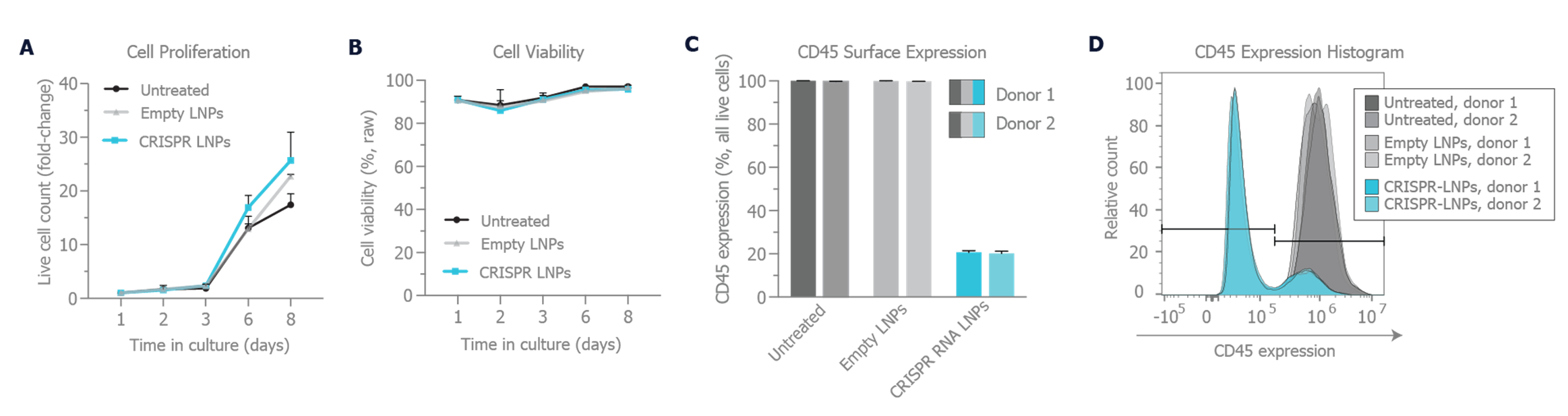 A) 细胞增殖和 B) 在 LNP 介导、靶向 CD45 经 CRISPR RNA-LNP 处理的 HSC 基因编辑后,对细胞存活能力超过 1 周的监测C) 通过流式细胞术分析 CD45 表面表达,对比 n = 2 个供体中 LNP 介导的基因编辑效果 D) 相应的直方图。