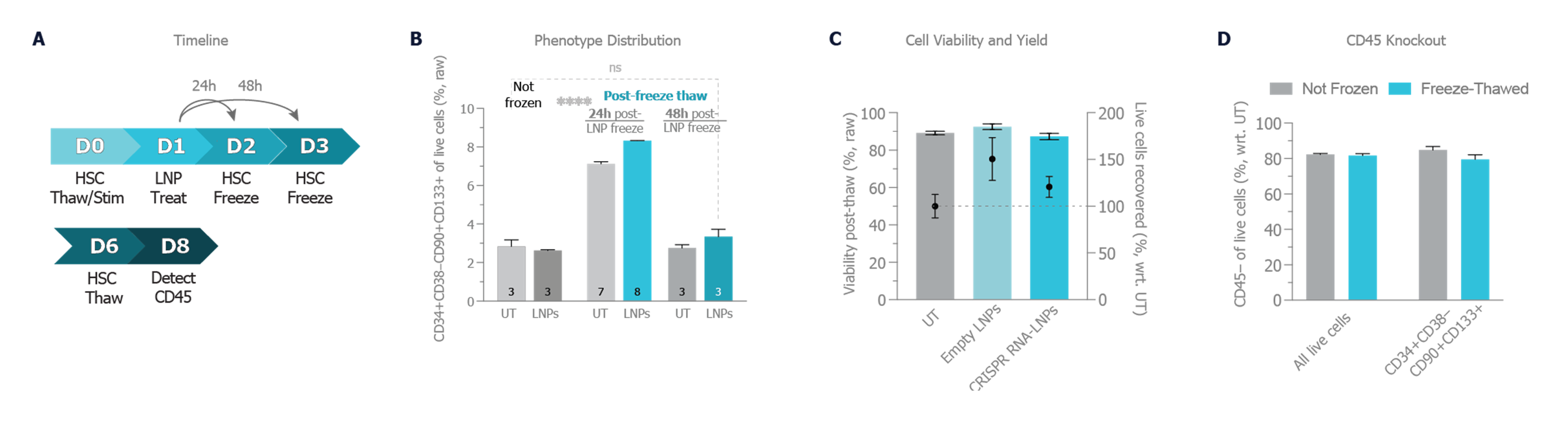 LNP 介导的 CRISPR Cas9 基因编辑后 HSC 的冷冻保存。A) HSC 冻融循环 (F/T) 的示意图。B) 经 LNP 处理后,在冷冻的 24 或 48 小时的时间点,评估解冻后或非冷冻状态下长期再增殖的 HSC 表型水平。C) 经 LNP 处理 24 小时后,在 F/T 循环下的细胞活力和活细胞恢复比率。D) 在总活细胞和可植入的表型 (CD34+ CD38- CD90+ CD133+) 的冻融和新鲜的经 LNP 处理 HSC 中,观察到的 CD45 敲除效率。