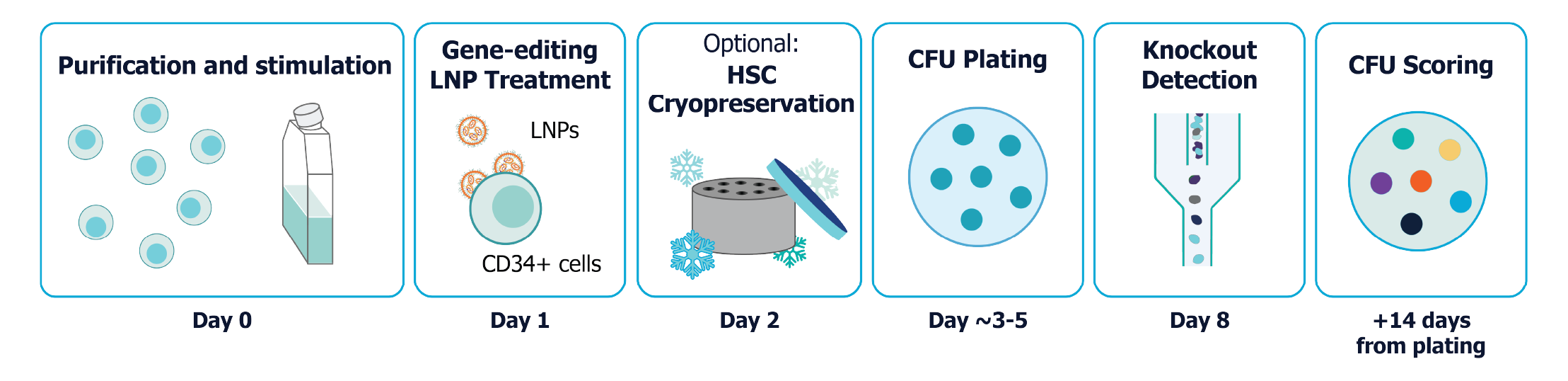 CD34+ HSC LNP 试剂盒易于并入 CD34+ HSC 工作流程中,可用于基于 mRNA 的基因表达和 CRISPR/Cas 基因编辑应用。一般工作流程概述如下。