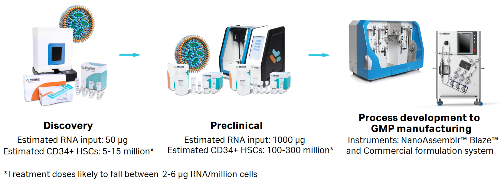 CD34+ HSC LNP 试剂盒可用于 NanoAssemblr™ Spark™ 和 NanoAssemblr™ Ignite™ 仪器。还可通过 BioPharma Services 对试剂进行规模扩大工艺开发和 GMP 生产。