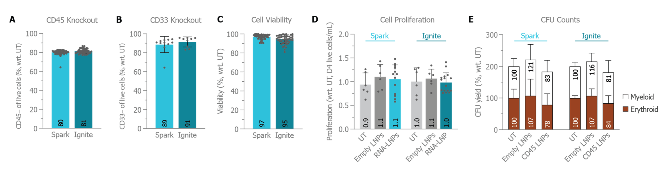 A) CD45 敲除和 B) CD33 敲除(总活细胞群),以及 C) 相应的细胞活力。A-C 包括 >20 项使用 >4 个独特供体的独特实验。D) 对未经处理、空 LNP 和装载 CRISPR-Cas9 RNA 的经 LNP 处理 HSC,使用自动细胞计数器评估了其增殖情况。E) 使用一个自动 CFU 计数器、5 项使用 Spark™ 的独立实验和 2 项使用 Ignite™ 仪器的独立实验评估未处理、空 LNP 和装载 CRISPR-Cas9 RNA 的经 LNP 处理 HSC 的克隆源性。