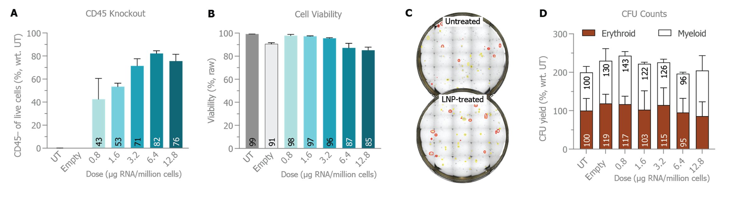A) NanoAssmblr™ Spark™ 仪器上产生的 CRISPR-Cas9 mRNA 和 sgRNA LNP 的 CD45 剂量反应。B) 相应细胞活力。C) 未经处理和经 CRISPR RNA-LNP 处理的 CFU 平板展示图片。D) 未经处理 (UT) 样品、空白 LNP 处理样品和经 CRISPR RNA-LNP 处理样品的标准化红系和髓系集落的产量。