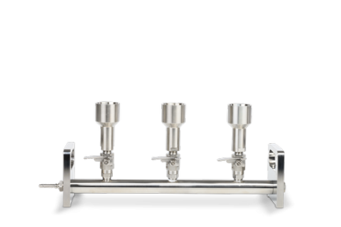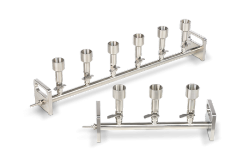 用于三个或六个过滤单元的不锈钢歧管配有不锈钢单元。该设备可在高达 180°C 的干热条件下进行高压灭菌和干热灭菌。仅适用于真空操作。若使用冲洗管,压强请勿超过 1.3 bar(300 mbar 过压)。