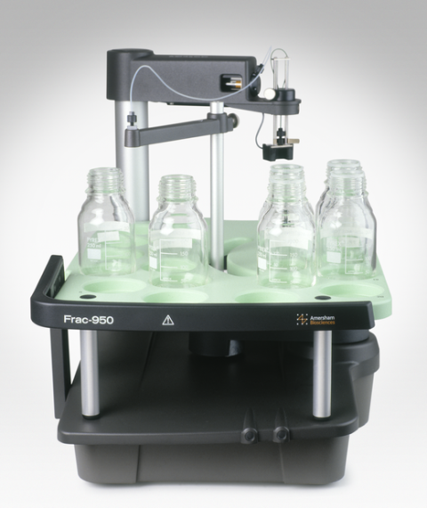 Frac-950 offers two independent ways of preventing sample loss and the highest flexibility in the choice of collection mode. Fractions are collected in microplates (over 384 fractions, up to 2.5 ml per fraction), or in a variety of test tube sizes (up to 250 ml per fraction). Collection is in volume or time mode and different fraction sizes can be collected during different stages of a separation. In standard fraction collection mode, fractions can be collected in 96-well microplates (up to four) and 12, 18, and 30 mm standard tubes. To deal with large fraction volumes, preparative mode allows fraction collection in eighty 30 mm standard tubes, twenty 250 ml bottles, or in 30 funnels, which connect to practically any vessel.