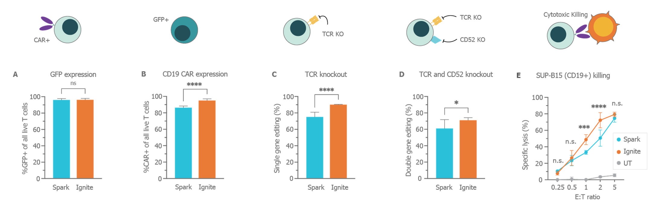 A) GFP 和 B) CD19 CAR 转染效率(添加 mRNA-LNP 后 24 小时)。C) 单靶(T 细胞受体,TCR)敲除的水平和 D) 双靶(TCR 和 CD52)敲除的水平(通过 sgRNA 和 Cas9 mRNA 递送实现)。E) 在 16 小时联合培养实验中对 CD19+ B 细胞 (SUP-B15) 的功能性杀伤作用。对于所有情况:将 3.2 μg RNA/百万细胞的剂量应用于人原代 T 细胞。RNA-LNP 是根据 Spark™ 或 Ignite™ 上用于 mRNA 的 GenVoy-ILM™ T 细胞试剂盒用户指南制备的。通过流式细胞术检测平均基因表达和基因敲除,显示最少 n = 8 份独立 RNA-LNP 制剂和 n = 2 个供体。通过流式细胞术检测功能性杀伤表现,显示 n = 2 份独立 RNA-LNP 制剂和 n = 2 个供体。误差线表示标准差,在选定组中使用 t 检验评价统计学意义 (2)。