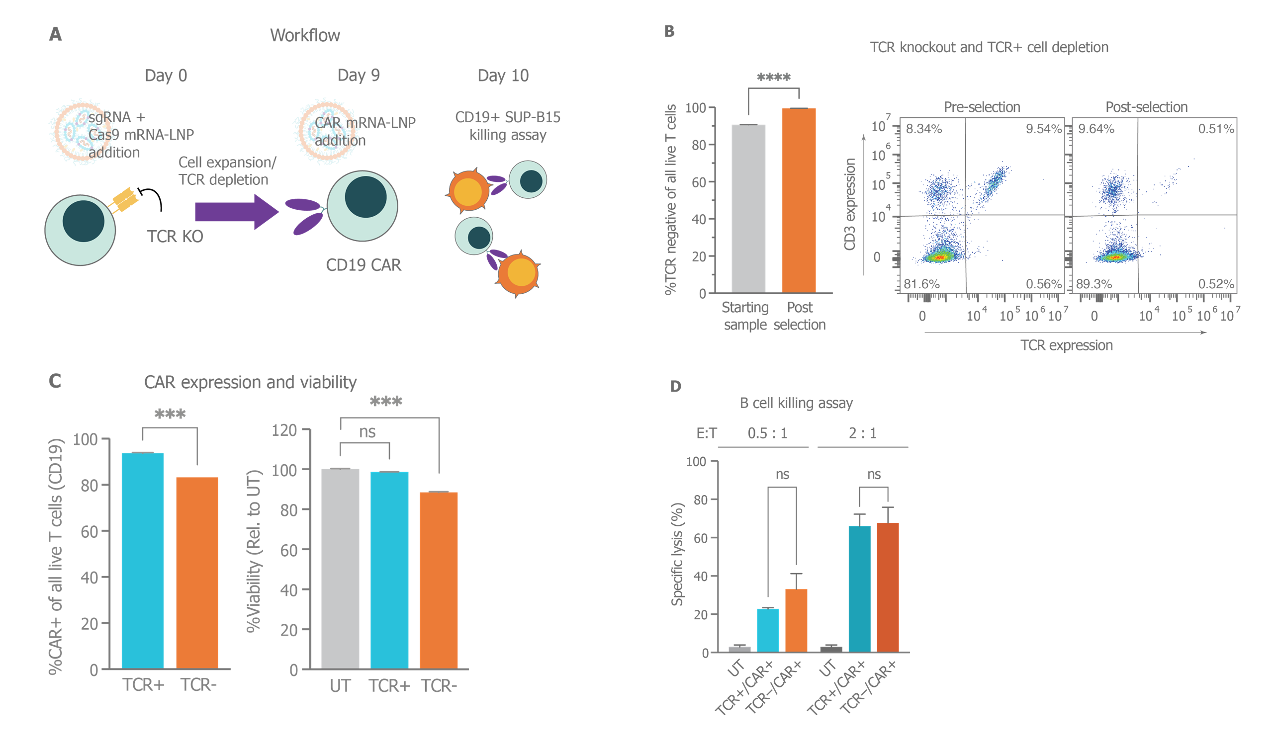 A) 实验示意图,将含有 sgRNA + Cas9 mRNA 的 mRNA-LNP 添加到原代 T 细胞中。在用 CD19 CAR mRNA-LNP 处理之前对细胞进行扩增。在 CAR mRNA-LNP 处理后 24 小时,进行 16 小时的 CD19+ T 细胞杀伤试验。B) 评估了 TCR 敲除效率。对起始样品进行 TCR 阴性选择,以进一步纯化 TCR 细胞群。C) 左侧:当细胞群为 TCR+ 或 TCR− 时,用 3.2 μg RNA/百万细胞的 CAR mRNA-LNP 处理 24 小时后的 CD19 CAR 表达百分比。右侧:标准化至未处理的细胞群后的相应细胞活力。D) 在所示效应细胞与靶细胞比率 (E:T) 下,通过 UT、TCR+/CAR+ 或基因编辑 TCR−/CAR+ T 细胞对 CD19+ B 细胞 (SUP-B15) 进行的功能性杀伤作用。对于所有情况,均应用 3.2 μg RNA/百万细胞的剂量。误差线代表标准差。在所示组中使用 t 检验或单因素 ANOVA 评价统计学意义 (2)。