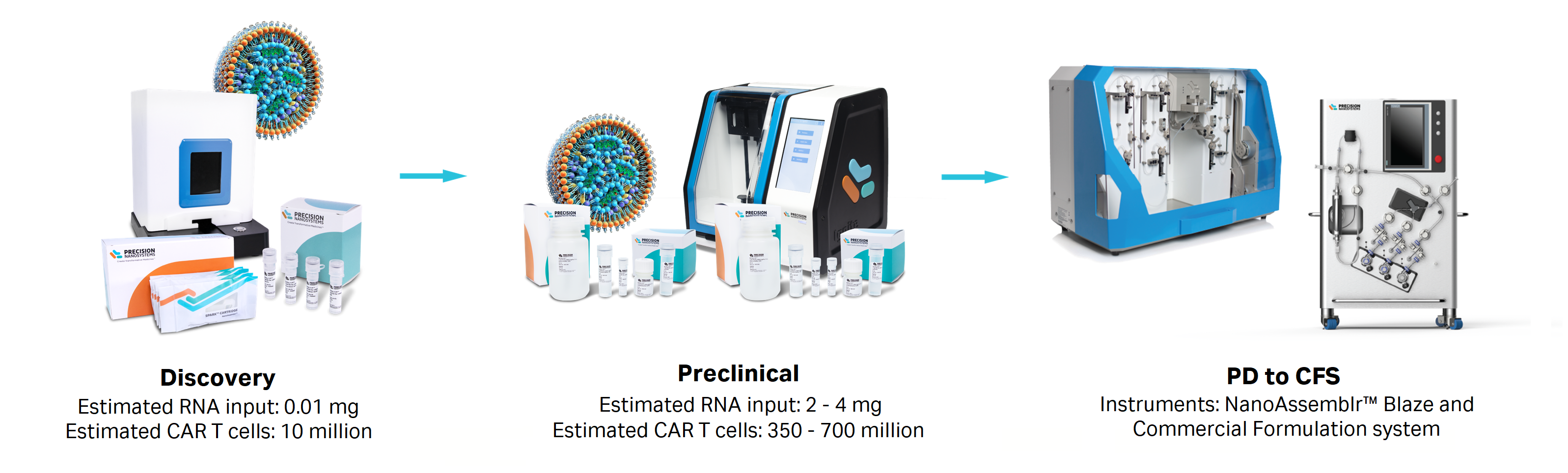 数据表明,GenVoy-ILM™ T 细胞试剂盒和可放大 NanoAssemblr™ 平台能够在 Spark™ 和 Ignite™ 仪器上实现可靠和等效的表现,从而从发现阶段扩大到临床前阶段。