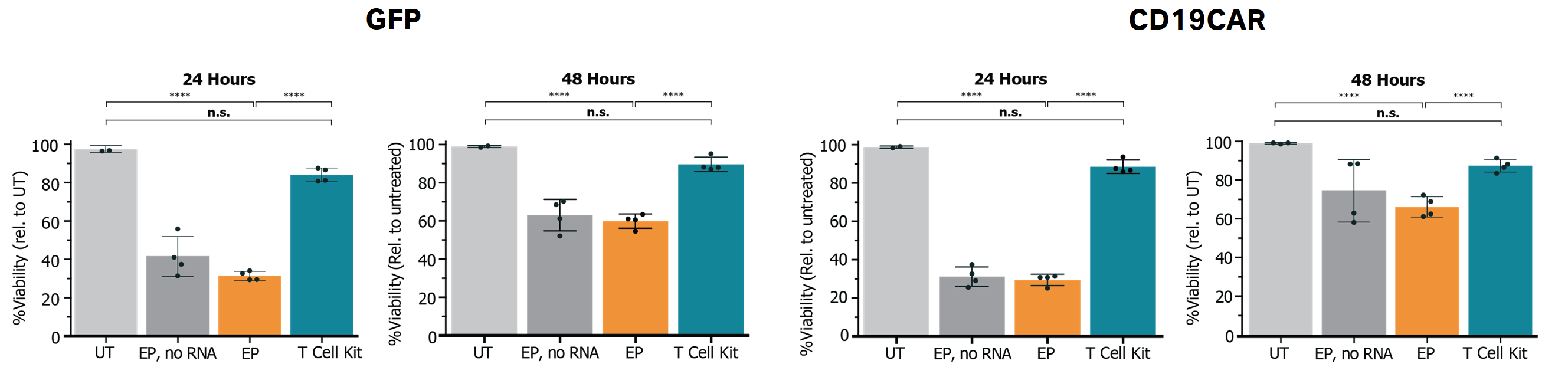 在处理后 24 和 48 小时通过流式细胞术测量细胞活力。EP 按照生产商的方案进行,而 LNP 处理按照 Spark™ 用于 mRNA 的 GenVoy-ILM™ T 细胞试剂盒方案进行。未处理的细胞 (UT) 用作对照。****p < 0.0001(单因素 ANOVA)。