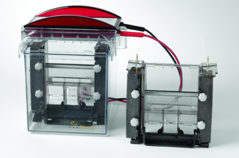 采用简单、模块化设计的 miniVE 垂直电泳系统,合并了所有电泳以及印迹所需的小组件,将其组合成一个简便装置。下槽缓冲液可保持凝胶的温度均匀。满槽缓冲液可稳定温度,从而使泳道平直,条带平整。印迹模块可以同时接受两块层叠的凝胶/膜。下缓冲液槽的设计支持两个印迹模块,一次允许执行四块凝胶的印迹。