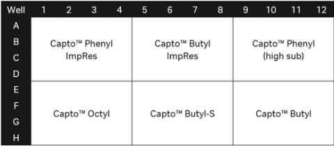 - The plates contain Capto™ Phenyl (high sub), Capto™ Butyl, Capto™ Octyl, Capto™ Phenyl ImpRes, Capto™ Butyl ImpRes, and Capto™ Butyl-S chromatography resins.