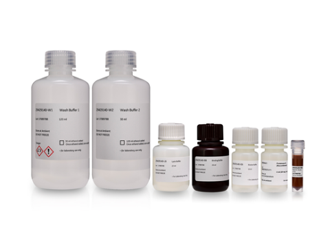 该试剂盒使用离液剂从样本中提取 DNA,使蛋白质组分变性,并促进 DNA 与二氧化硅涂层磁珠的选择性结合。蛋白酶 K 是用于对样本蛋白进行酶切的首选蛋白酶,因为即使样本中存在酶抑制剂(如乙二胺四乙酸 (EDTA) 和去污剂),蛋白酶 K 仍具有活性。随后用乙醇缓冲液洗涤二氧化硅磁珠,即可轻易去除变性污染物。已纯化基因组 DNA 在低离子强度缓冲液中洗脱,以适用于大多数下游分子生物学应用。