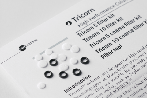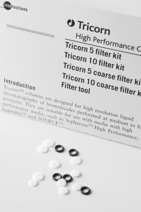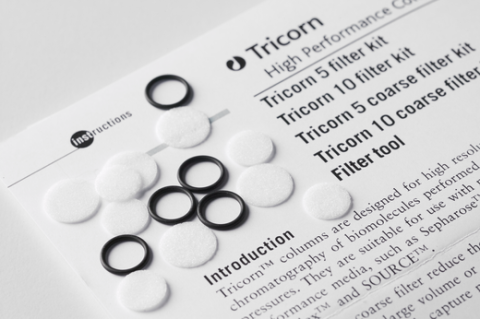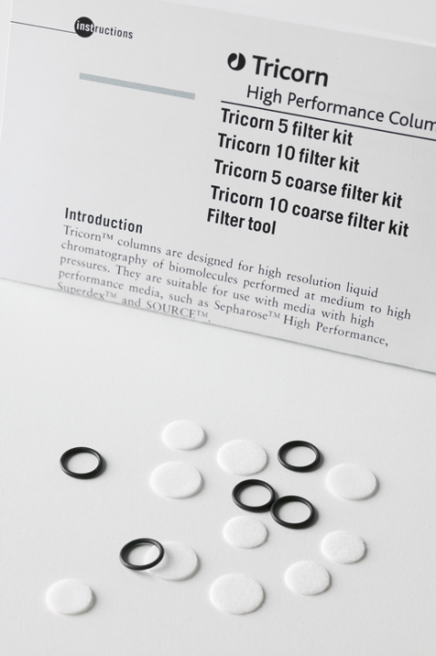 Tricorn 5 和 10 层析柱的过滤膜套件提供三种孔径。对于大多数应用,选择标准的 7 µm 孔径。使用中等 18 µm 孔径对进行填料(如 MabSelect SuRe pcc 或 MabSelect PrismA)结合的多克隆 IgG 抗体或 mAb 的纯化。使用粗过滤器 (> 25 µm) 可减少使用大体积或重复加载澄清样品时捕获填料的堵塞风险。